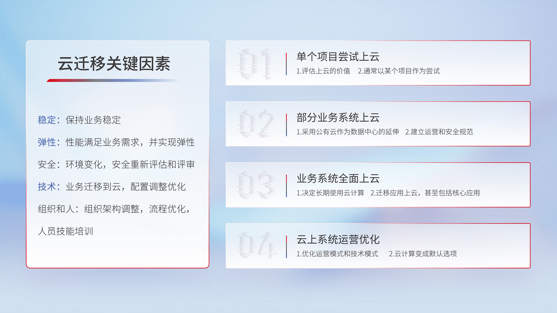 结合实际业务,,,从规划设计、、、、云平台选型、、云原生改造、、、数据迁移、、、、集成交付,,,迁移全过程为客户识别最佳上云路径,,,做好风险识别管理,,,,设计网络架构、、、、身份权限、、安全审计合规、、操作审计、、、日志审计、、监控告警策略、、、多站点容灾设计等,,,,对云上基础设施进行整体规划,,,,提升IT治理水平,,,,以满足弹性、、高可用、、、高性能的需求。。。。